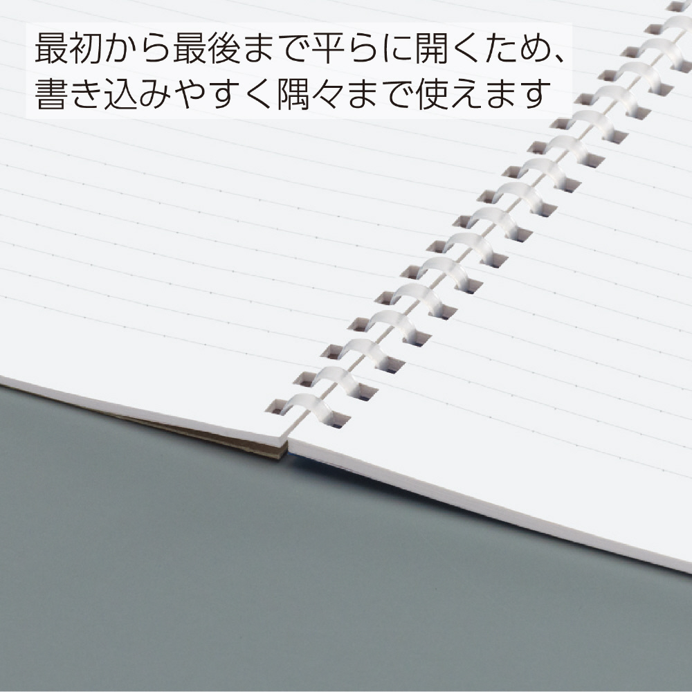 ・平らに開くので書き込みやすい、平らに折り返せるので狭い場所でも心地よく使える、といったリングノートのよさはそのままに、書くときリングに手が当たっても気にせず端まで美しく書ける、これからの新定番ノートです。