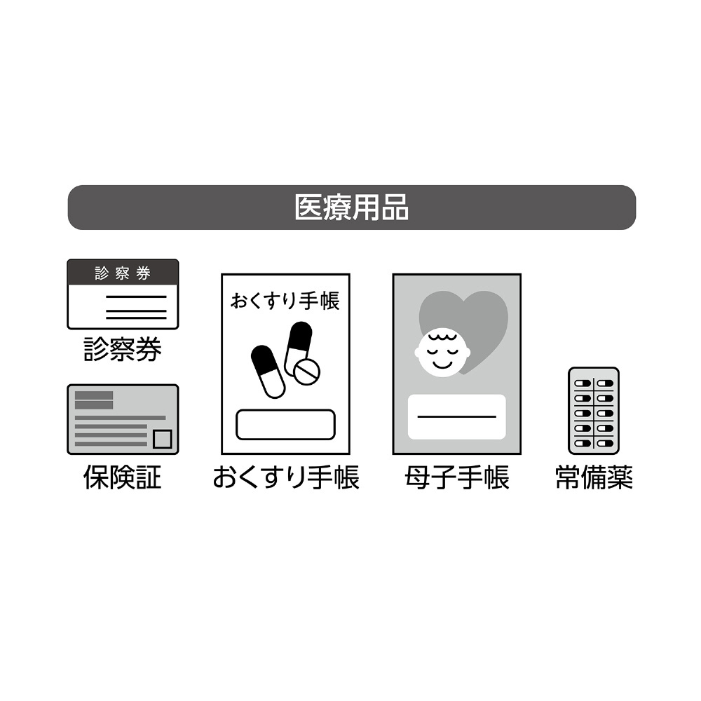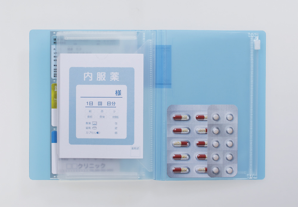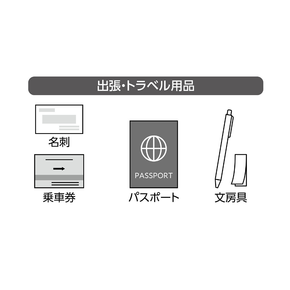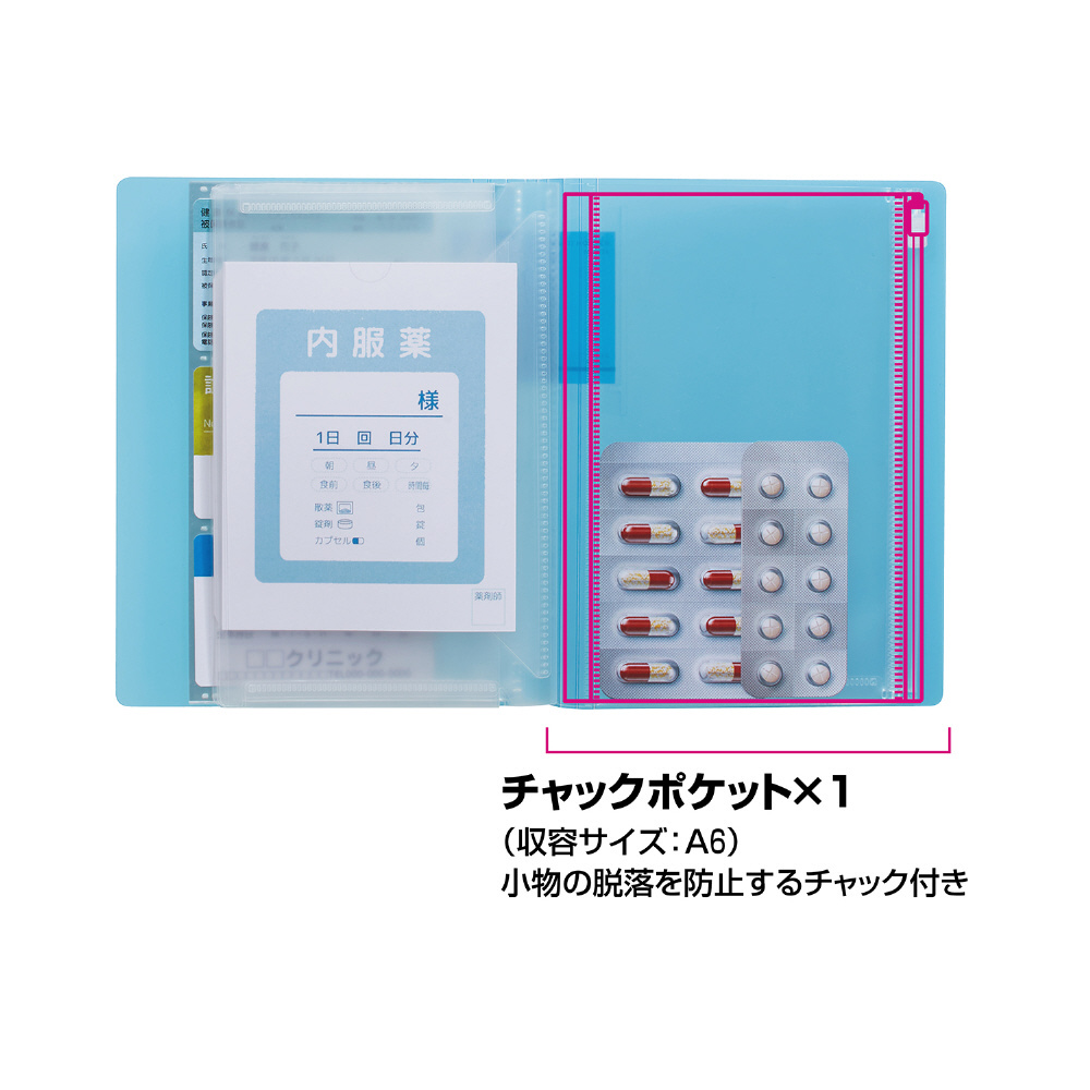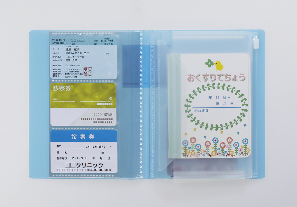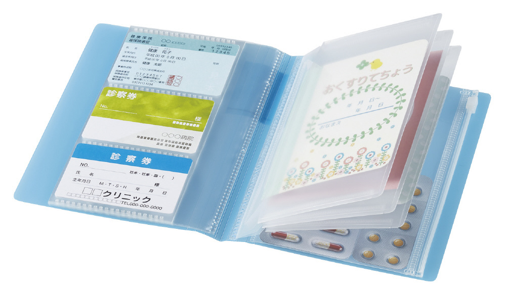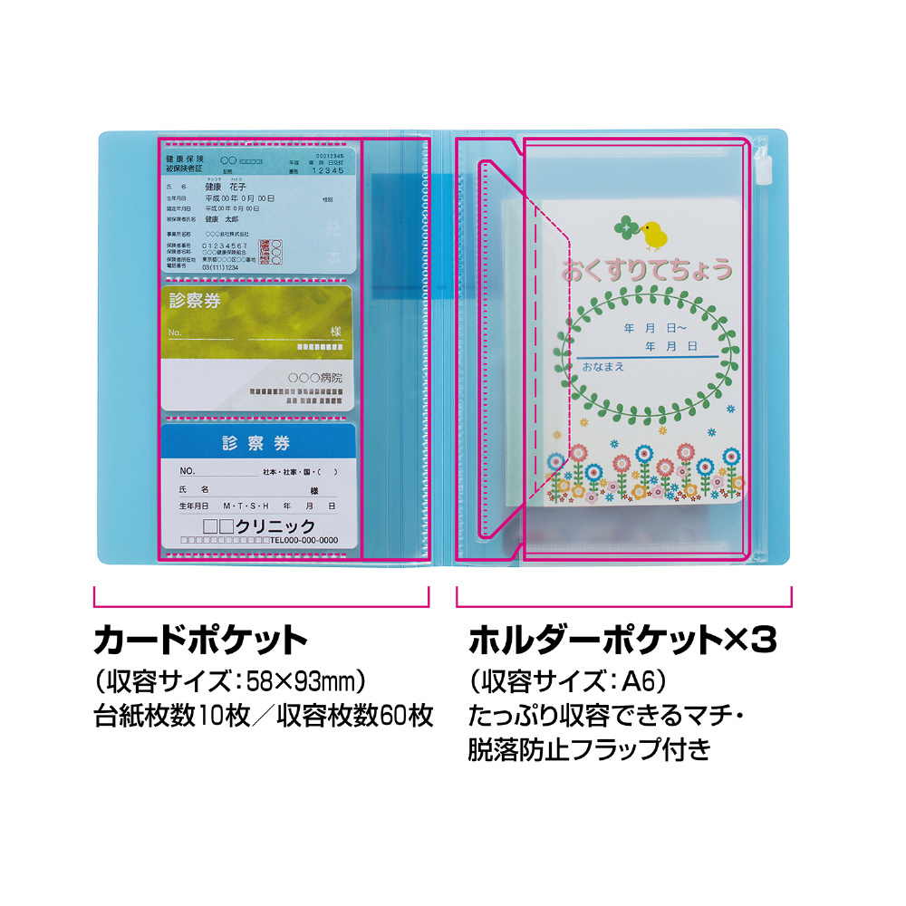 ●3種のポケットで、カードやA6 サイズの冊子(おくすり手帳、年金手帳など)、小物(クリップ、ペンなど)をまとめて整理することができます。