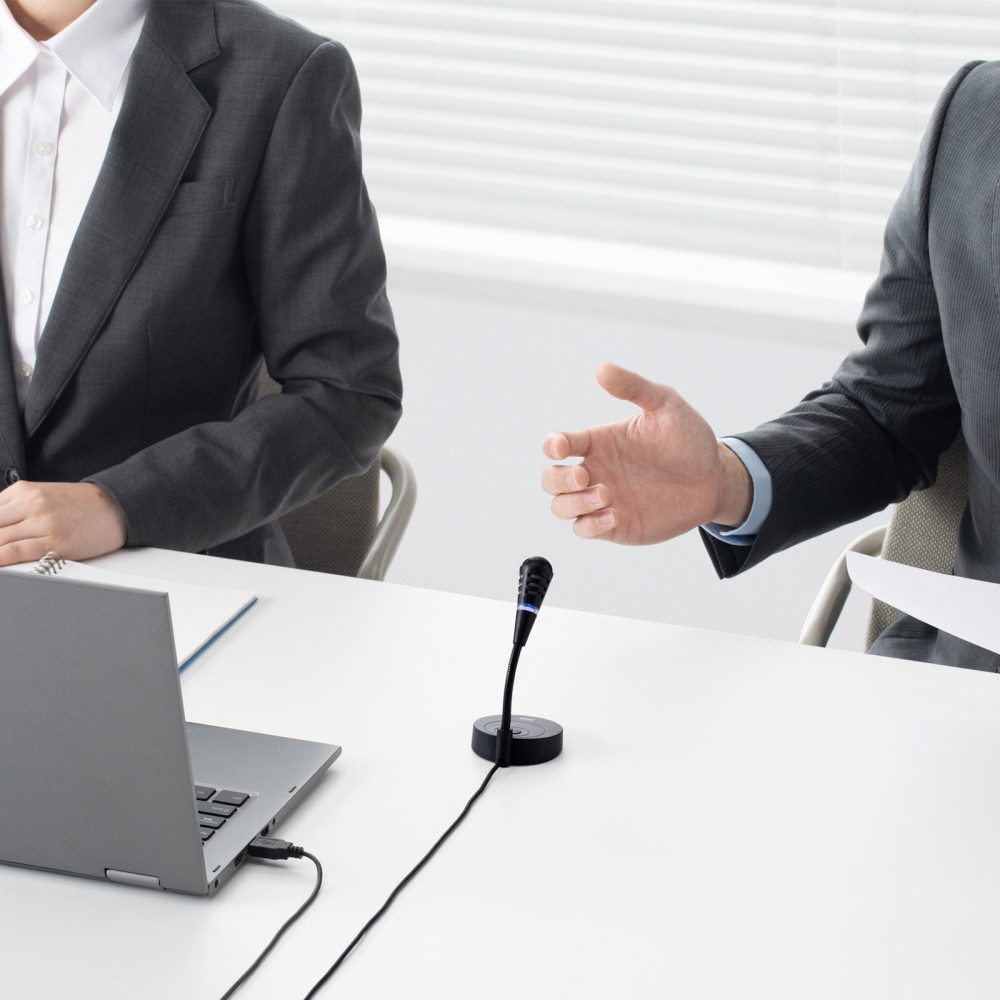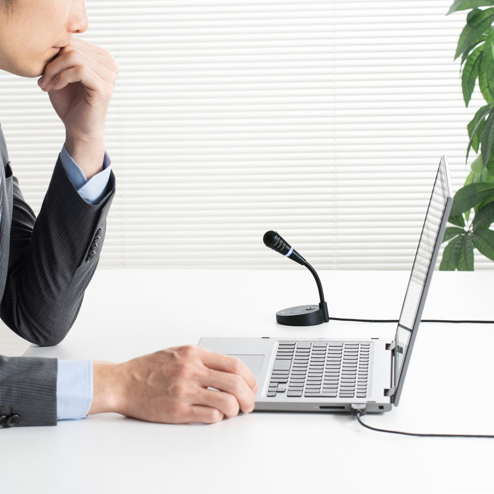周囲の雑音を拾いにくい単一指向性のコンパクトUSBマイク。Zoom、Teamsにも対応。