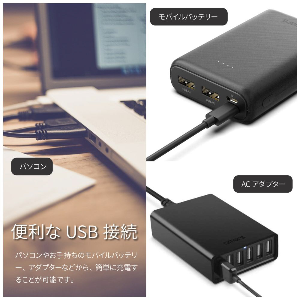 パソコンやお手持ちのモバイルバッテリー、アダプターなどから、簡単に充電することが可能です。