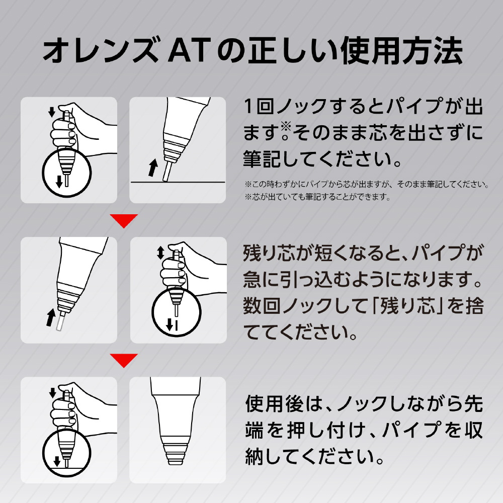 また、ペン先で芯を守って書くから折れない「オレンズシステム」を搭載。芯の減り具合に合わせて、ペン先のパイプがスライドします。パイプで芯を守ったまま書き続けられるため、芯が折れません。