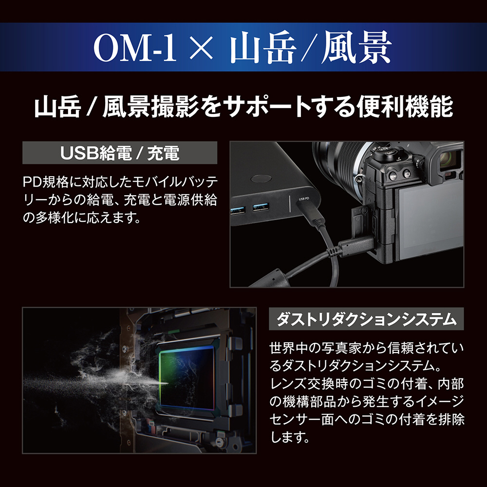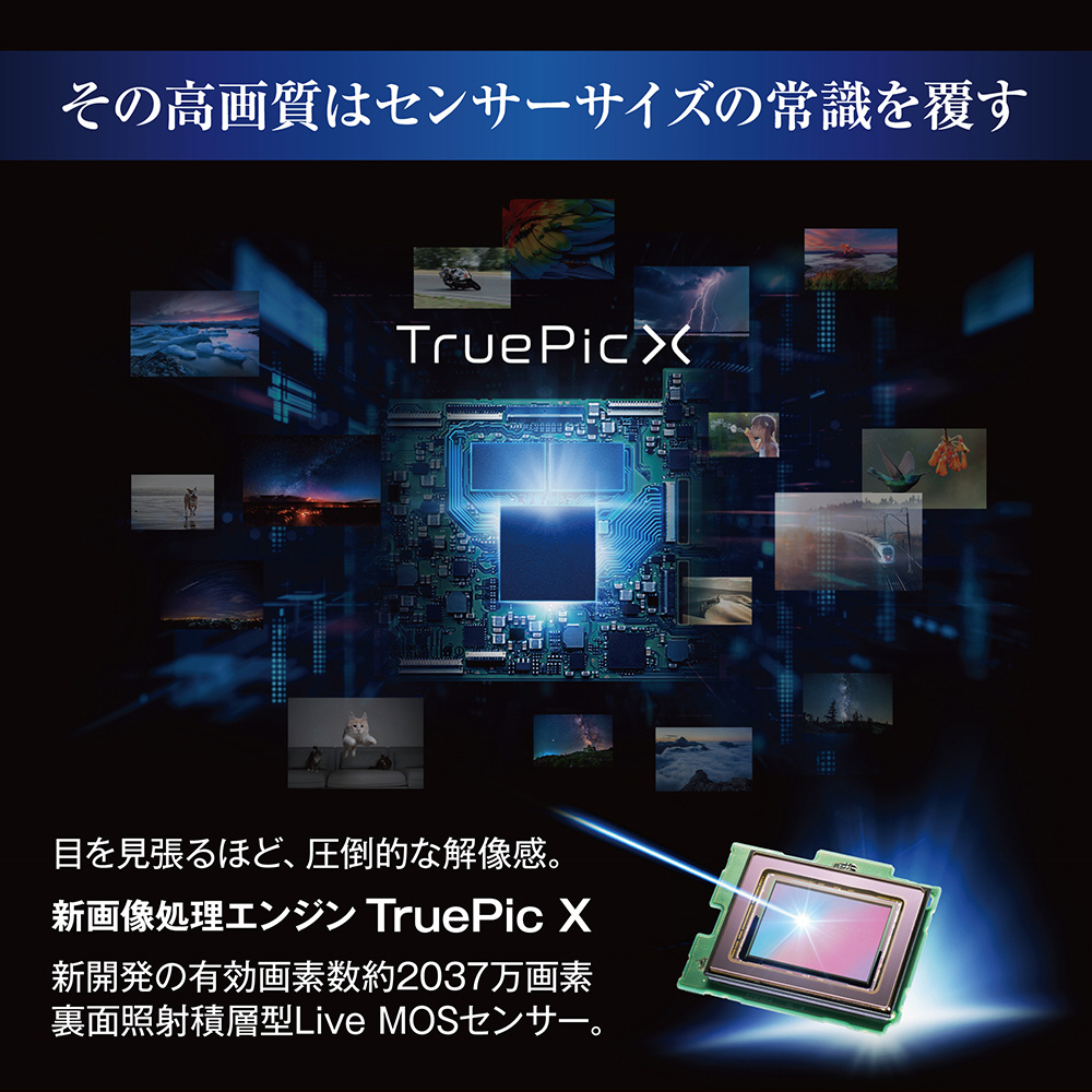 新開発の「有効画素数 約2037万画素裏面照射積層型 Live MOSセンサー」と、従来比約3倍の高速化を達成した最新の画像処理エンジン「TruePic X」を搭載することで、センサーサイズの常識を覆す高画質を実現。当社史上最高の解像感が得られるだけでなく、新たなノイズ処理技術により、常用で最高ISO 25600、拡張で最高ISO 102400の高感度を達成。さらに、最新の画像処理技術によってダイナミックレンジも向上。「OM SYSTEM」の強みである高性能な手ぶれ補正は、「5軸シンクロ手ぶれ補正」で最大8.0段、ボディー単体で最大7段の補正効果を実現。