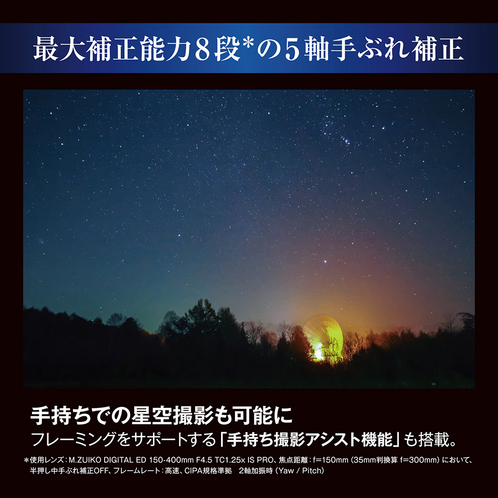 ・「ライブコンポジット」 明るく変化した部分のみを比較明合成するため、メリハリのある美しい比較明合成写真を簡単に撮影できます。手ぶれ補正にも対応し、手持ちでの撮影が可能です。