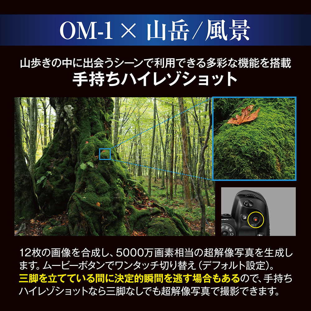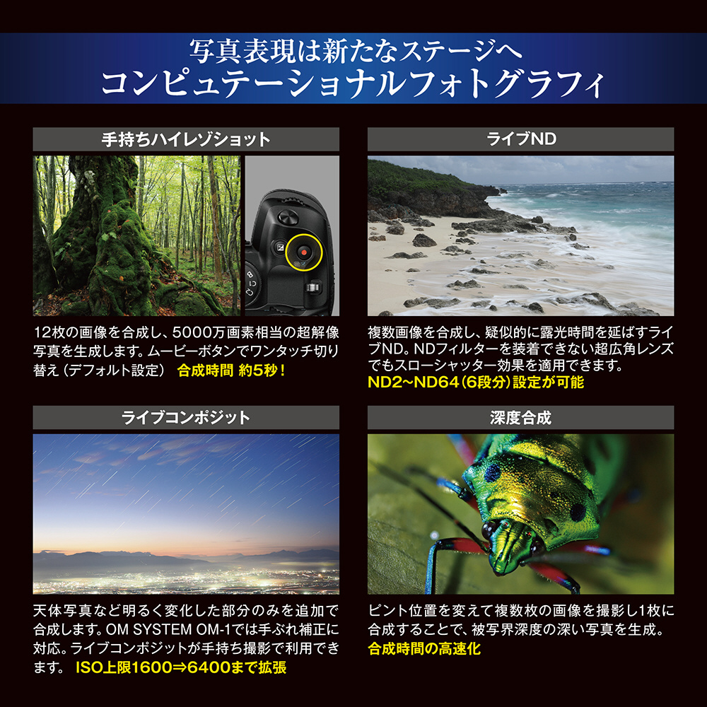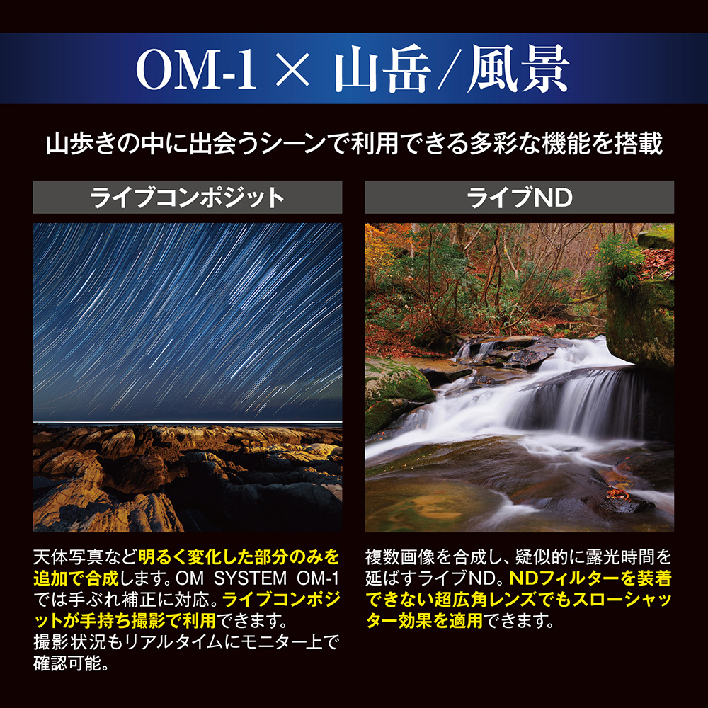 「OM SYSTEM」は、従来特殊な機材やパソコンによる画像合成などで実現していた写真表現を、先進のコンピュテーショナル フォトグラフィ技術を駆使することでカメラ内の画像処理のみで実現し、いち早く撮影機能として一眼カメラに搭載してきました。「OM SYSTEM OM-1」はさらに使いやすく進化。一眼カメラならではの幅広い表現力を生かした映像撮影が可能に。
