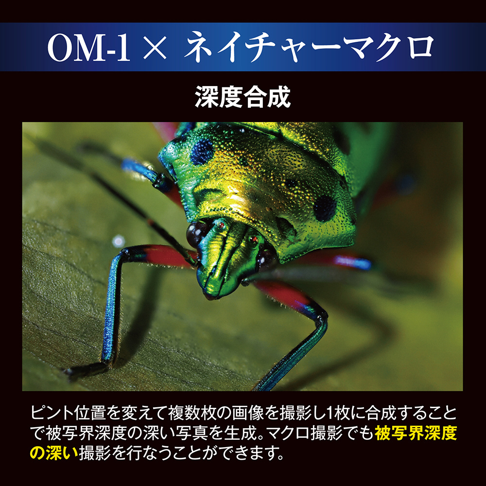 ・「深度合成」 ピントをずらした複数枚の写真を合成し、手前から奥までピントが合った被写界深度の深い写真が撮影できます。合成時間が大幅に短縮されました。
