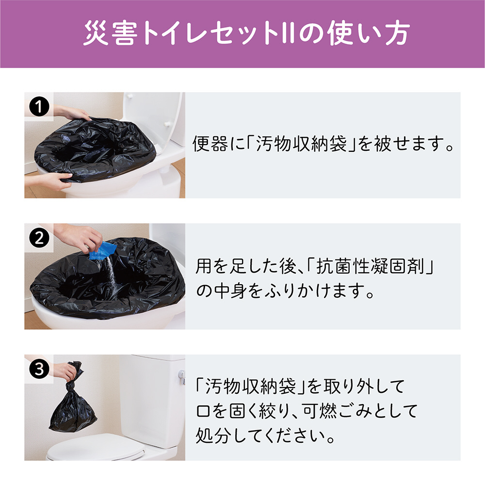 ふりかけるだけで汚物を固める凝固剤には、気になるニオイを抑える抗菌タイプを採用。ポケットティッシュをたっぷり6個同梱しているほか、使用済みの汚物収納袋をまとめて可燃ごみとして捨てられる廃棄用の大袋もセット。災害時の衛生にも配慮したアイテムを厳選しています。