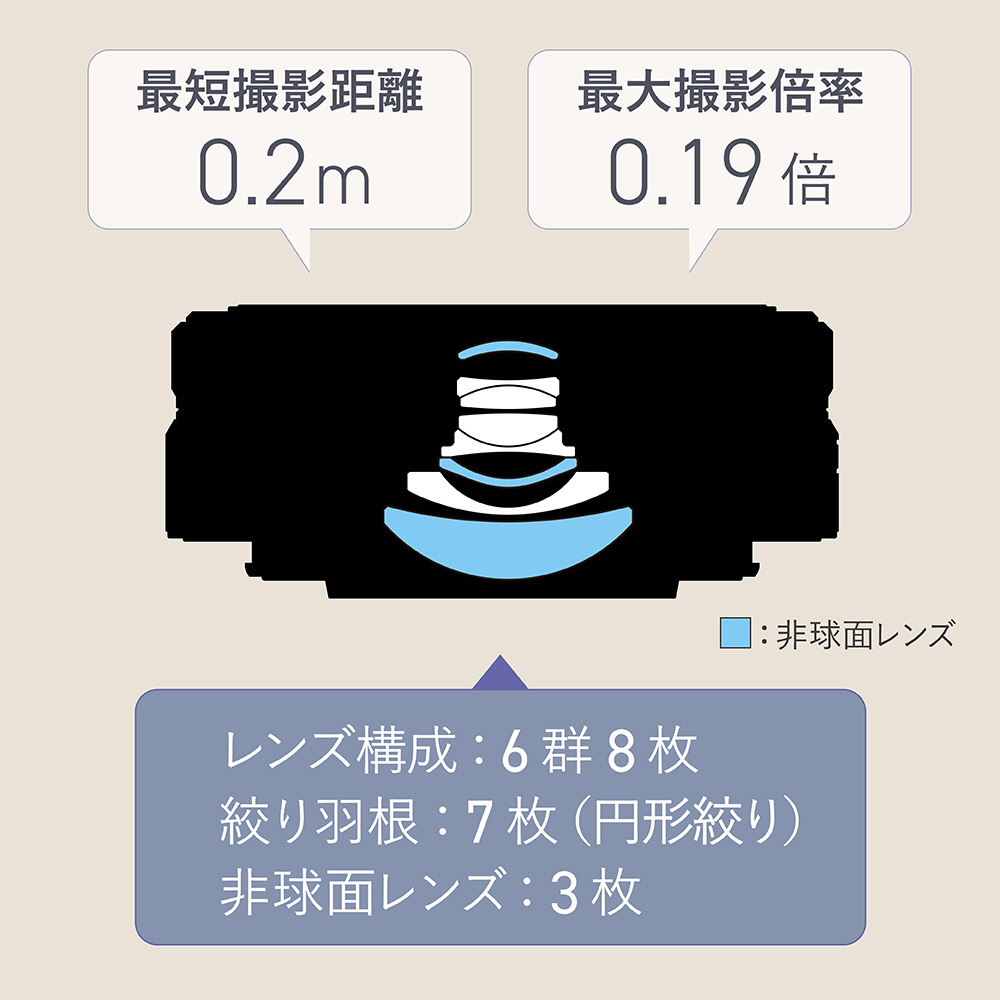 | レンズ構成 | 6群8枚(非球面レンズ3枚) |