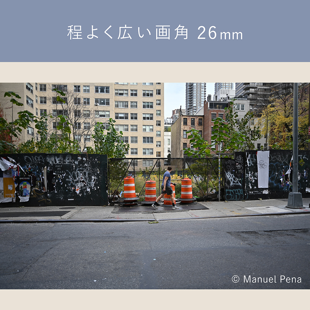 焦点距離26mmの程よく広い画角で、パースを生かした街角のスナップや、風景撮影、テーブルフォトなど幅広いシーンで活躍します。