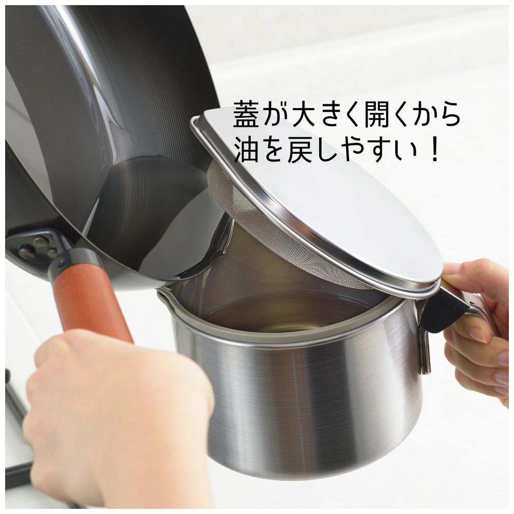 蓋が大きく開いて油の戻しやすく、油切り網付き。