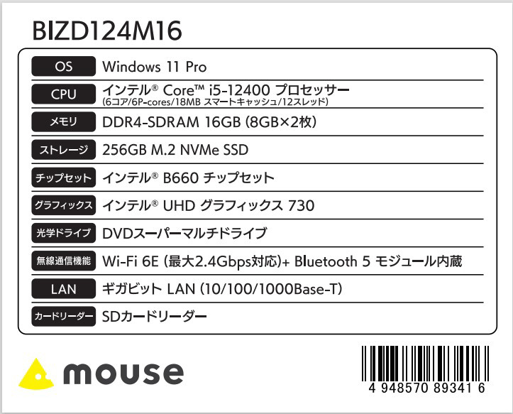BIZD124M16 デスクトップパソコン mouse [モニター無し /Windows11 Pro /intel Core i5 /メモリ:16GB /SSD:256GB /無し]