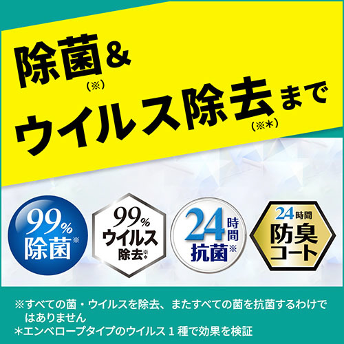 99%除菌(※1)、99%ウイルス除去(※2)、24時間抗菌(※1)、24時間防臭コート