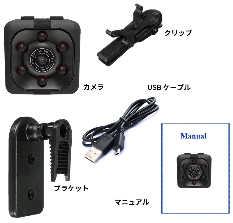 専用のクリップやブラケットを使ってアクションカメラやドライブレコーダーとして使えるほか、暗視撮影機能や動体検知機能も付いているので、防犯カメラとしての使い道も。小さいボディを生かして様々なところに設置可能です。