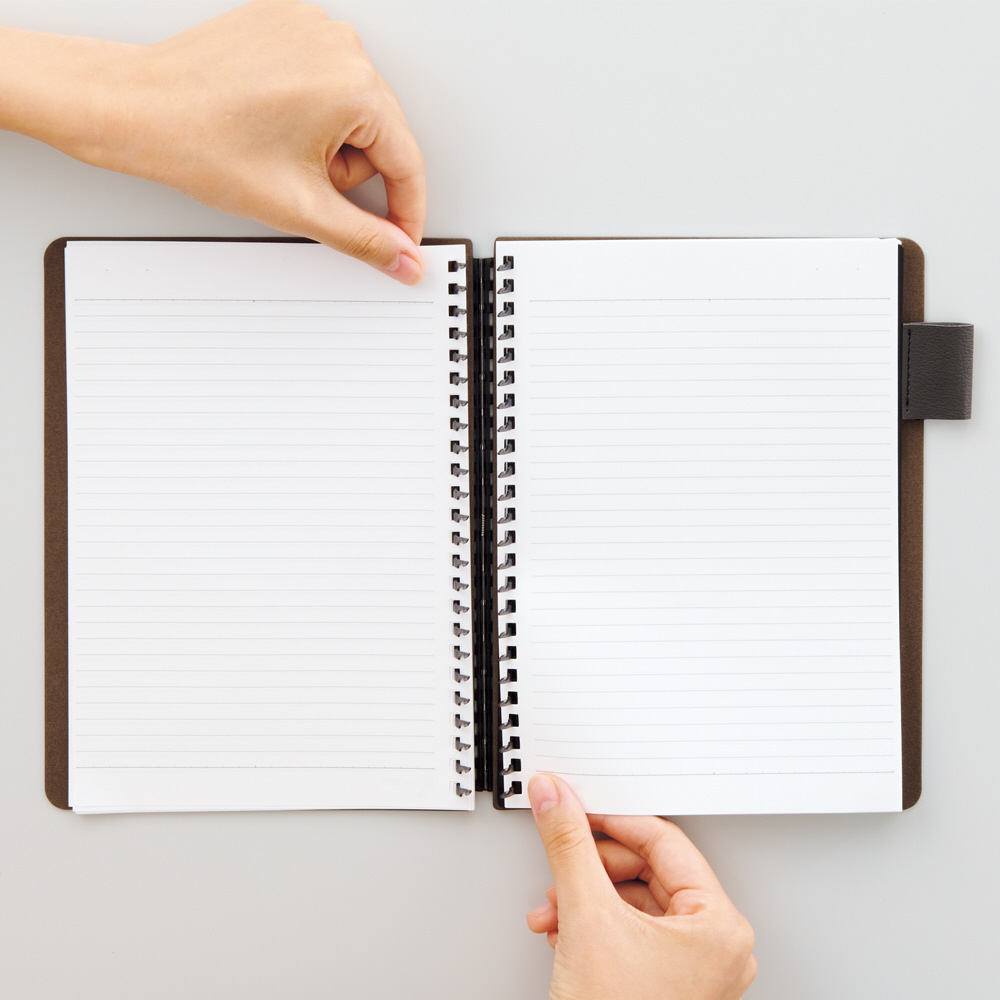 リングが開くのでリーフの差しかえができ、使い方に合わせてカスタマイズしやすいのが特長です。あけるとき:リーフを持ち、斜めに軽く引くと、とじ具が開きます。とじるとき:リングをつまみ、指を滑らせて音がするように順番に閉じると簡単です。下敷きになるペンホルダー付き。最大軸径13mmまでのペンを収容できます。※ 細いペンはクリップをご利用ください。※ 縫製商品の為、サイズが若干異なる場合があります。