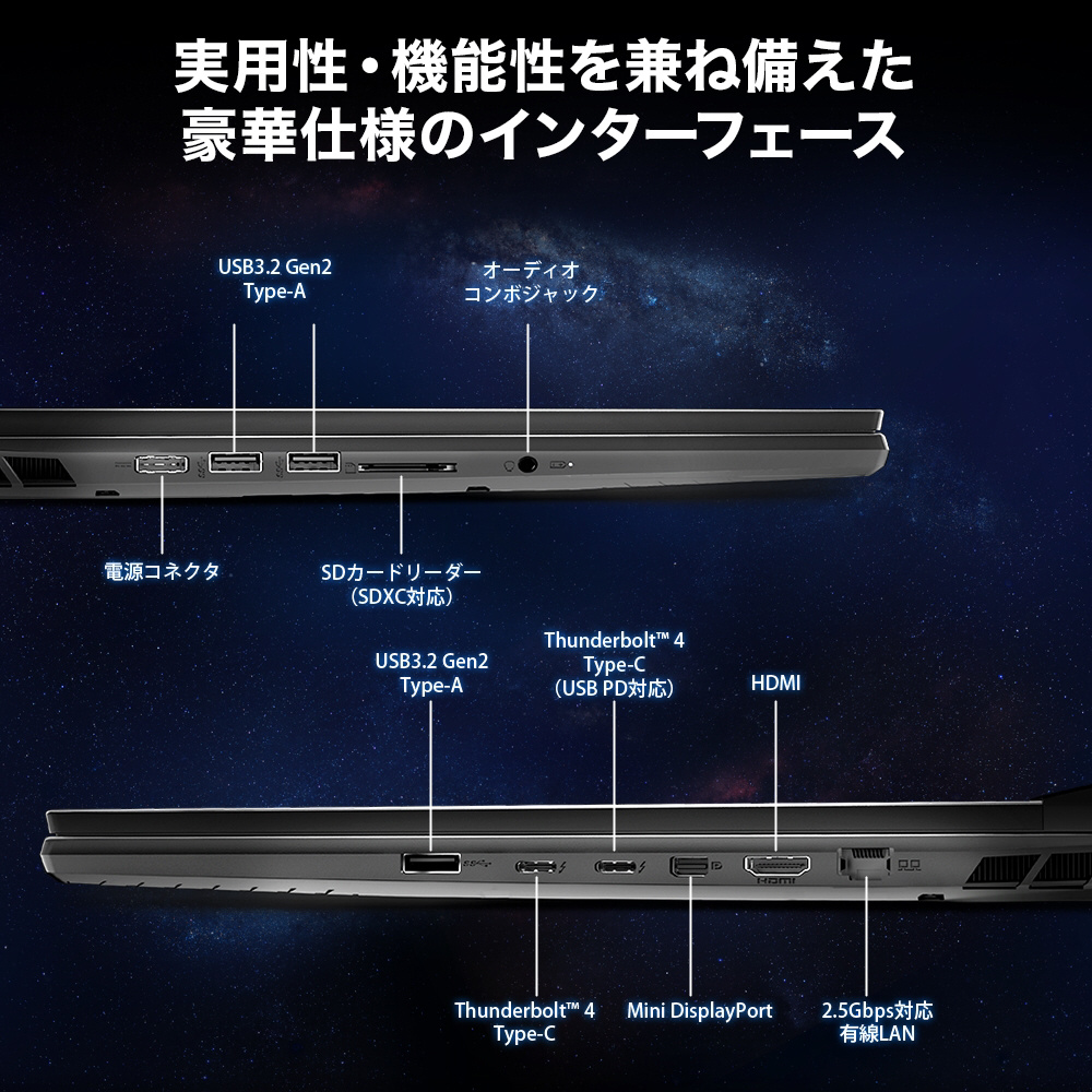 | インターフェイス | 有線LAN 2.5Gbps ×1 SDカードリーダー(SDXC対応)×1 Thunderbolt 4 Type-C(USB PD対応)×1 Thunderbolt 4 Type-C ×1 ※USB PD非対応 USB3.2 Gen2 Type-A ×3 Mini DisplayPort ×1 HDMI ×1 オーディオコンボジャック ×1 |
