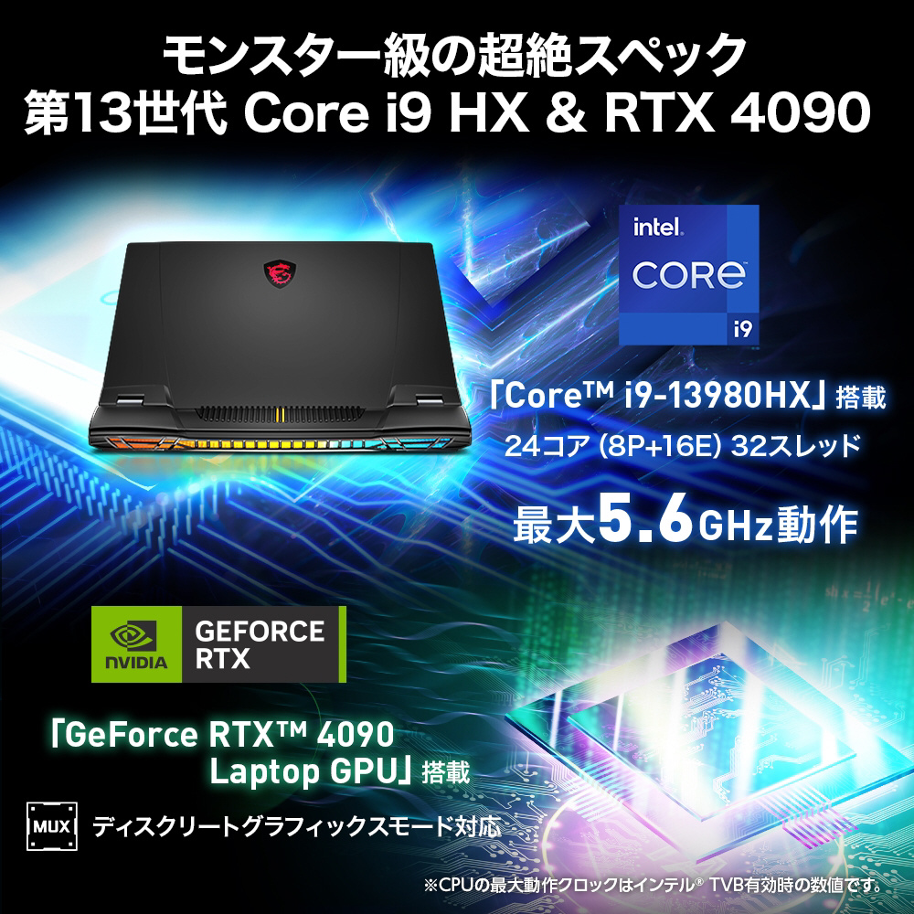 超メニーコアなCore i9 HX プロセッサーとGeForce RTX 4090 Laptop GPUの驚異的なパワーにより、ゲーム・クリエイティブ・研究開発などあらゆる用途に対応。