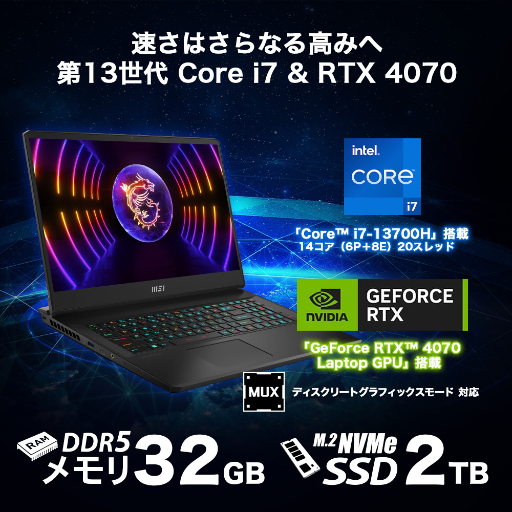 VECTORGP77-13VG-1024JP ゲーミングノートパソコン [RTX 4070/17.3型/Windows11 Home/intel Core i7/メモリ:32GB/SSD:2TB/日本語版キーボード/2023年2月]