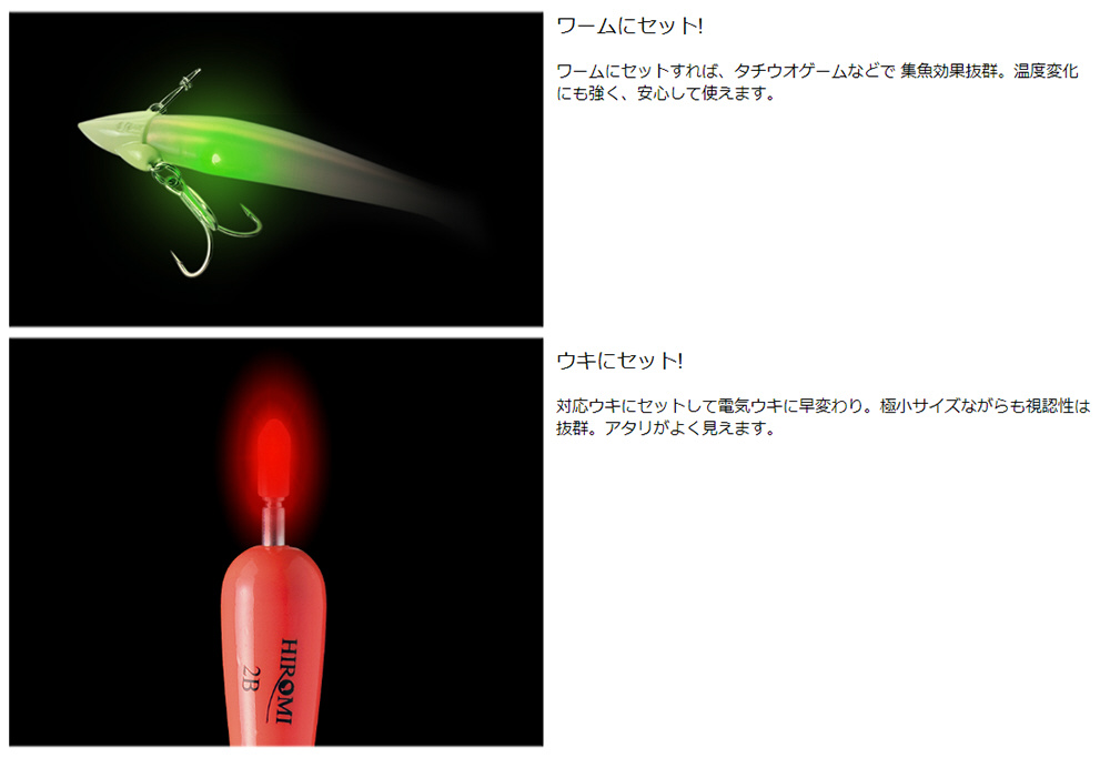 極小サイズなので、仕掛けにセットしたり、竿先ライトにも最適。タモにセットすれば、取り込みの際のライトとして使用できます。また、タックルボックスに入れておけば、暗闇で探し物の目印として使えます。