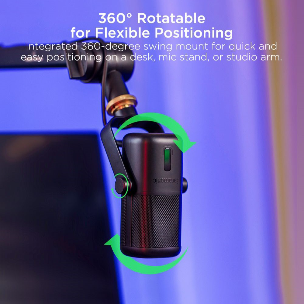 また、360度スイングマウントにより、デスク、マイクスタンド、スタジオアームに素早く簡単にポジショニングできます。