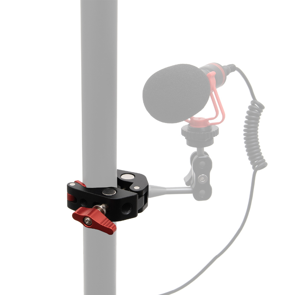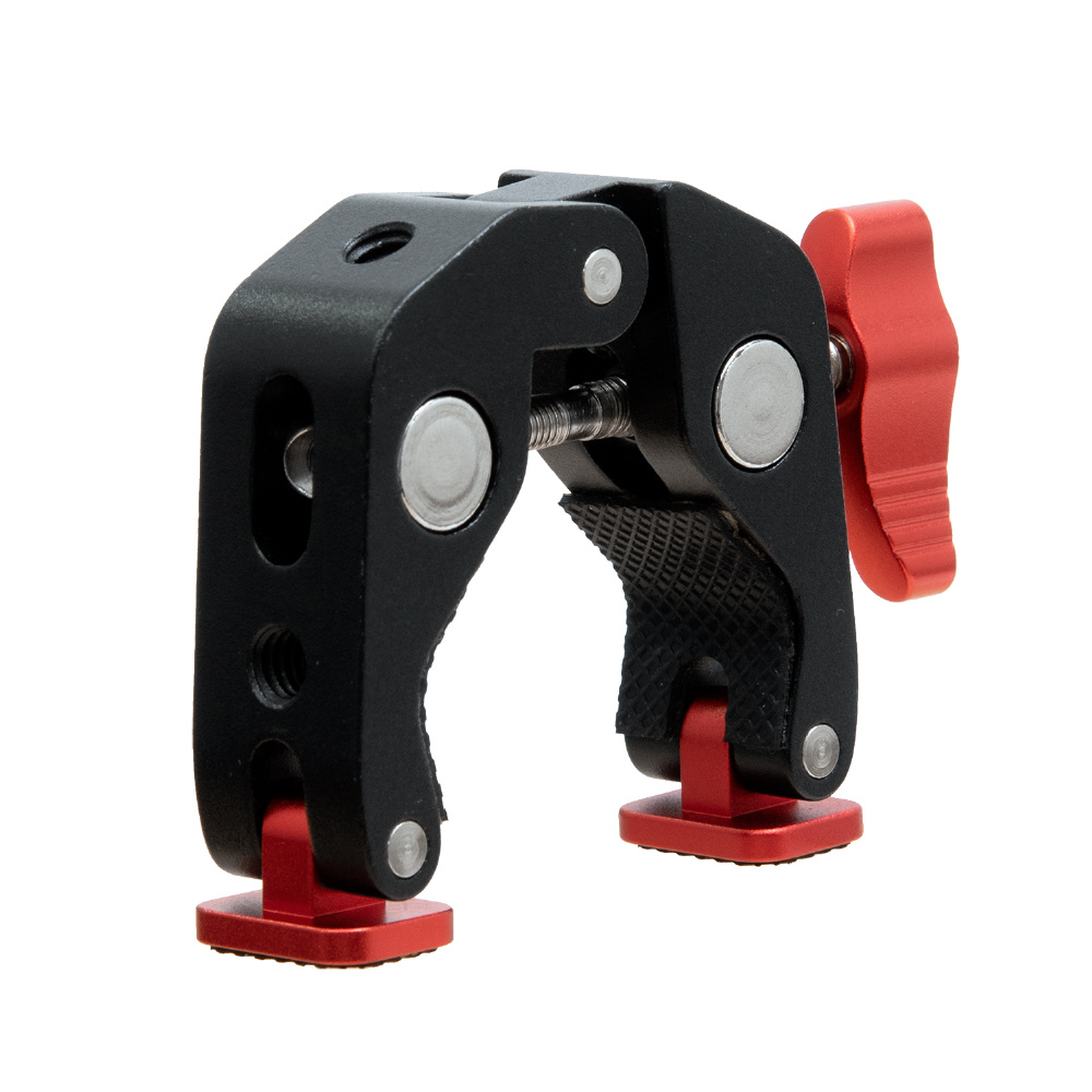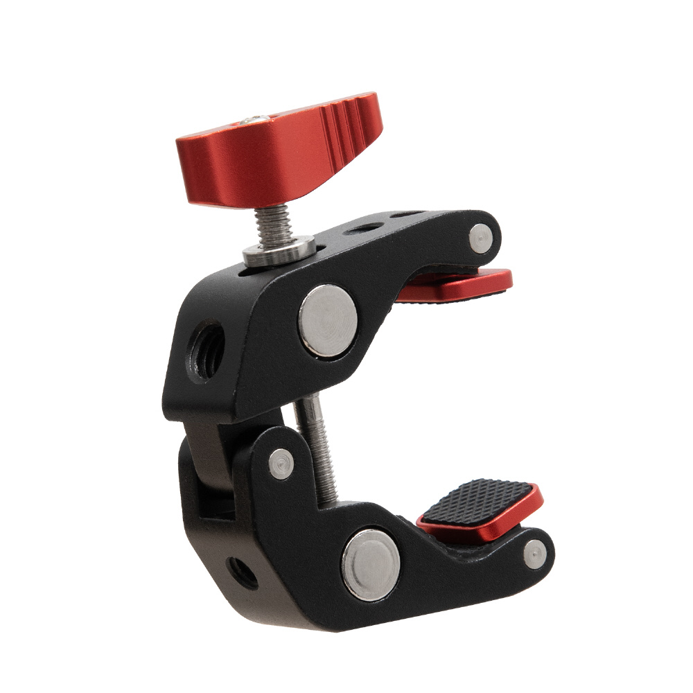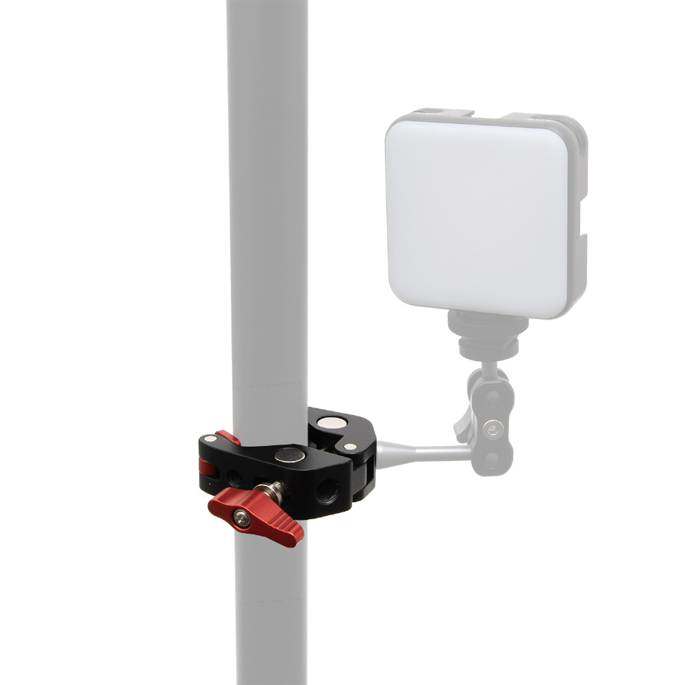 1/4インチが3ヶ所と3/8インチが1か所の2サイズのネジ穴が付いた、丈夫なアルミ製のメタルクランプです。三脚のパイプやライティングスタンドのポール、デーブルなど様々なところに挟んで固定できます。クランプで挟み込む部分をゴム製にし、先端部を回転式にすることで、挟む相手側の形状に合わせてしっかりと固定でき、傷が付きにくくなっています。別売りのマジックアームと組み合わせて、モニターやLEDライトなどの各種アクセサリーを装着する際に便利なアイテムです。