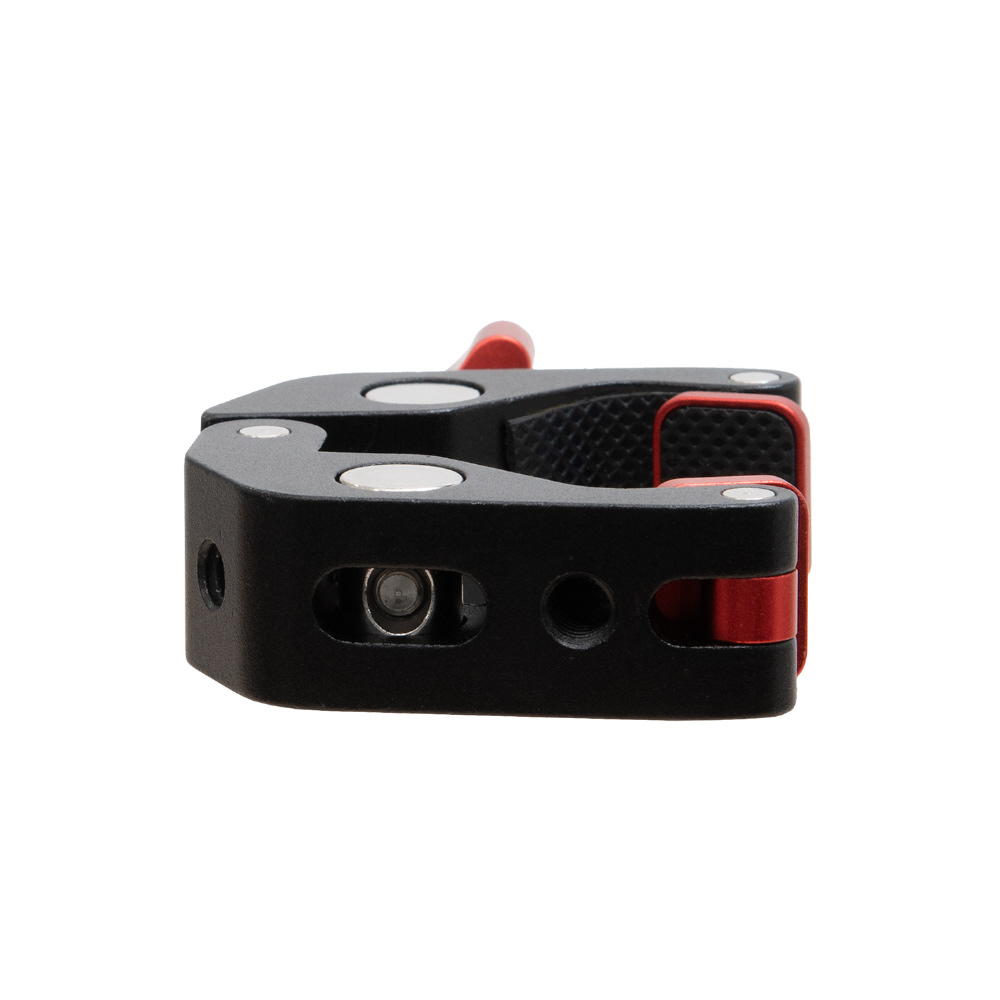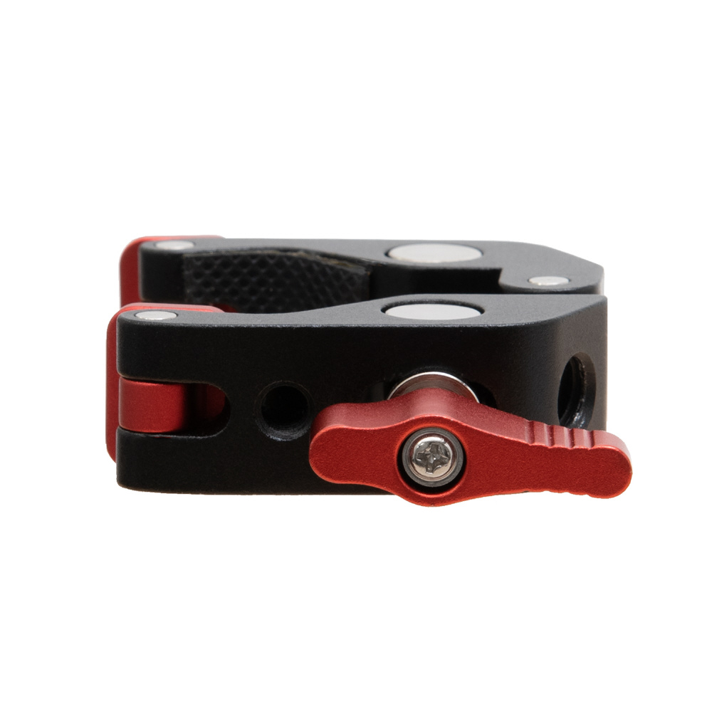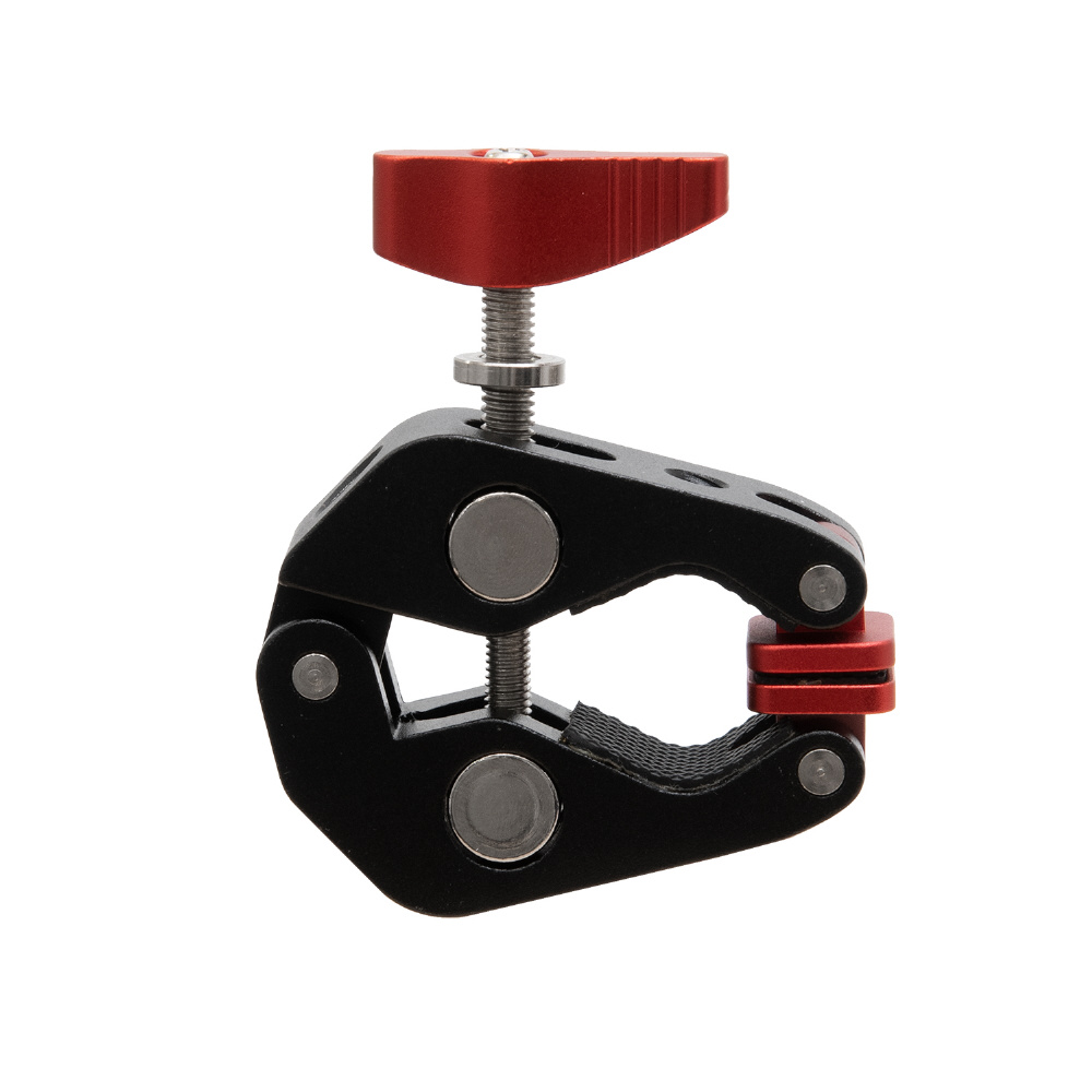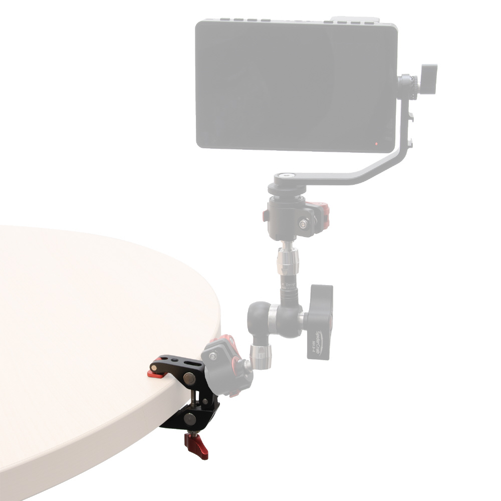 1/4インチが3ヶ所と3/8インチが1か所の2サイズのネジ穴が付いた、丈夫なアルミ製のメタルクランプです。三脚のパイプやライティングスタンドのポール、デーブルなど様々なところに挟んで固定できます。クランプで挟み込む部分をゴム製にし、先端部を回転式にすることで、挟む相手側の形状に合わせてしっかりと固定でき、傷が付きにくくなっています。別売りのマジックアームと組み合わせて、モニターやLEDライトなどの各種アクセサリーを装着する際に便利なアイテムです。