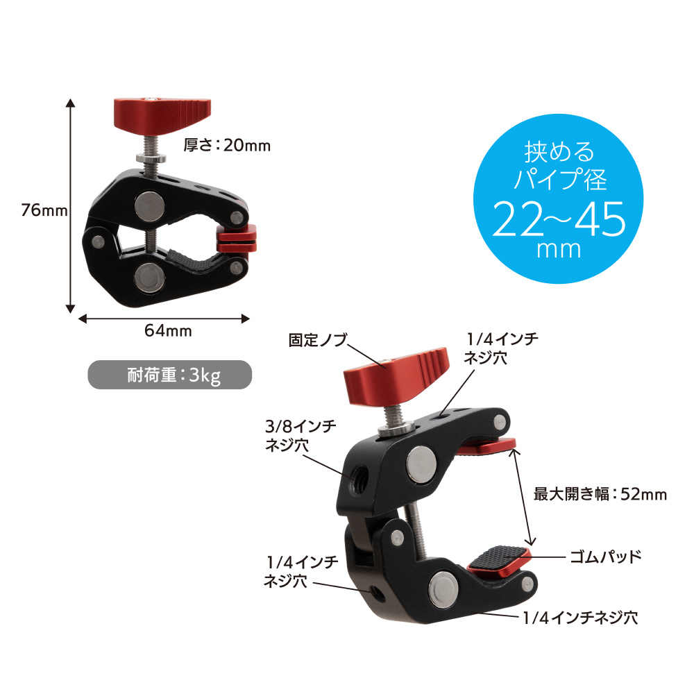 ●挟めるパイプ径:22〜45mm