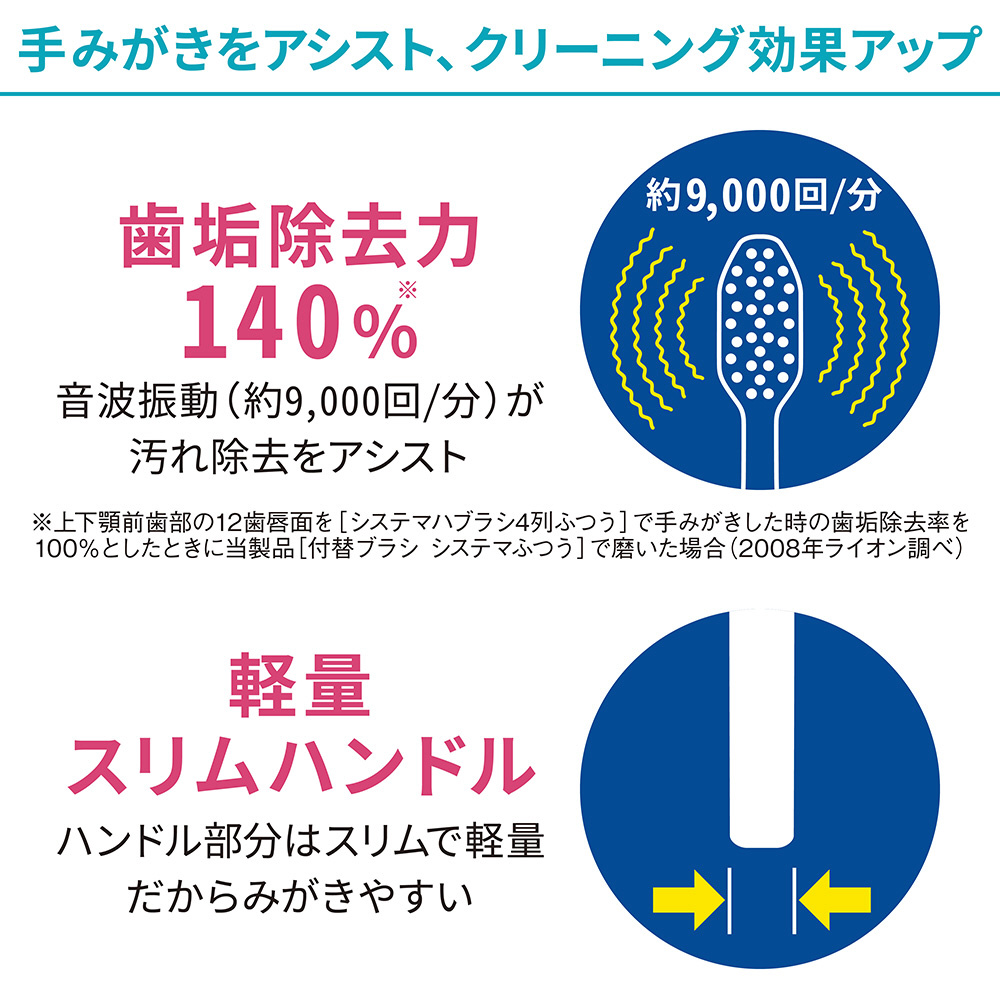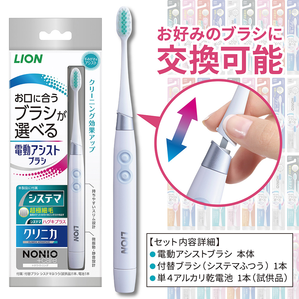 自分の口に最適なブラシを装着してブラッシングすることで、音波振動が手みがきをアシストしてクリーニング効果がUPする電動“アシスト”ブラシ。