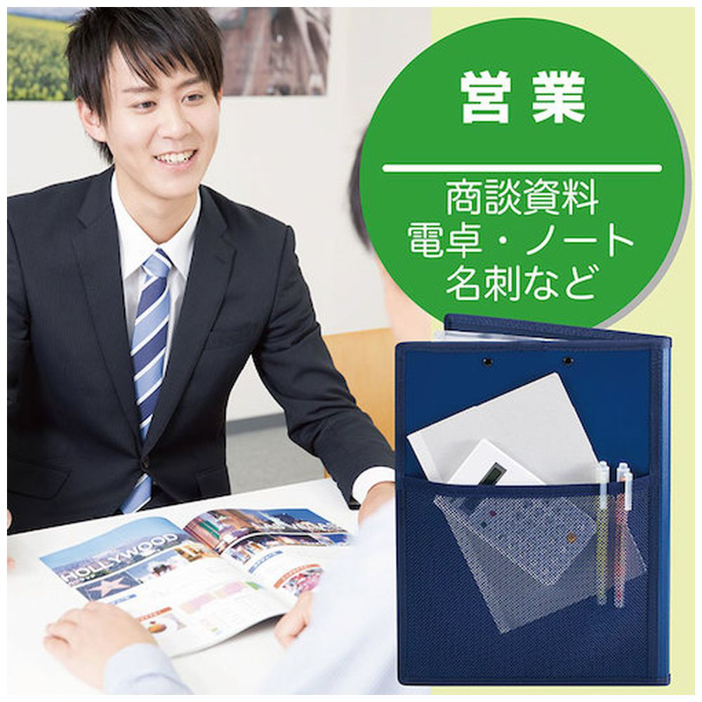 ■メッシュポケットやペンホルダーに加え、クリアーホルダーも入る「オープンポケット」(1枚)、A4書類が入る「クリアーポケット」(5枚)、小物を入れられる「チャック付きポケット」(1枚)、名刺が約15枚収納できる「名刺ポケット」(1枚)がつき、収納力が充実しています。