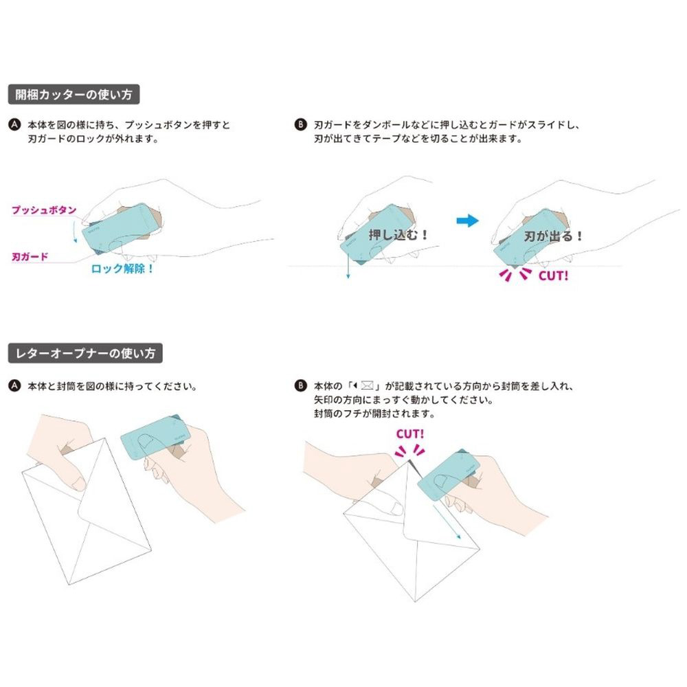 段ボールの開梱には、「カッター機能」で、手紙や封筒の開封には、「レターオープナー機能」。