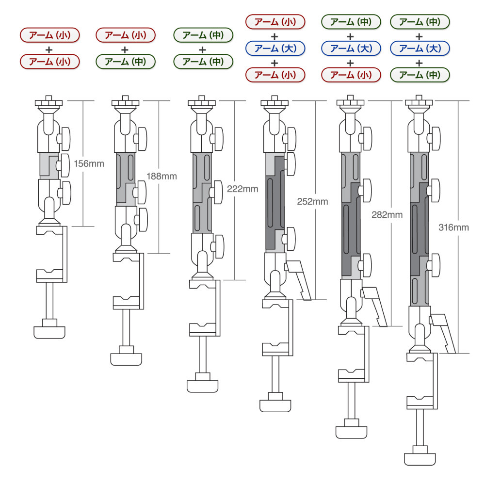 ■アームの組み合わせにより、6通りの長さに変更することができます。