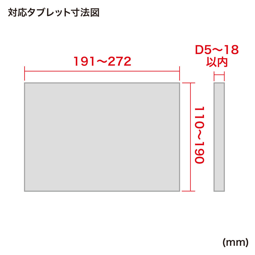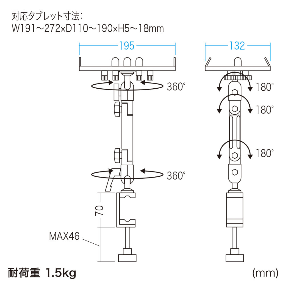 | 仕様1 | [対応機種] 幅191〜272×奥行き119〜190×厚さ5〜18mm、重量1.5kg以下、7〜11インチサイズのiPad・タブレットPC 9.7インチiPad 2017 9.7インチiPad Pro 9.7インチiPad Pro + Cellular iPad Air 2 iPad Air 2 + Cellular iPad mini 3 [クランプ対応サイズ] 丸パイプ/直径10〜30mm 角パイプ/10×10〜40×40mm 天板/厚さ10〜40mm |