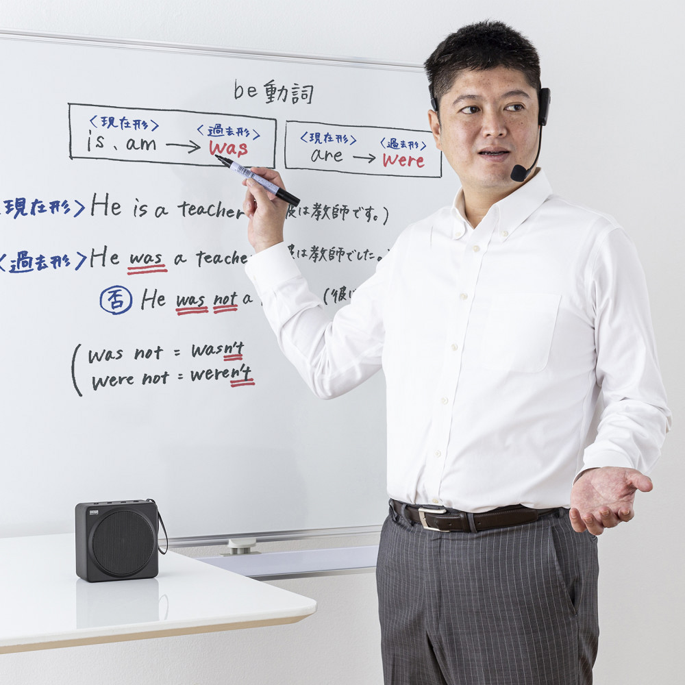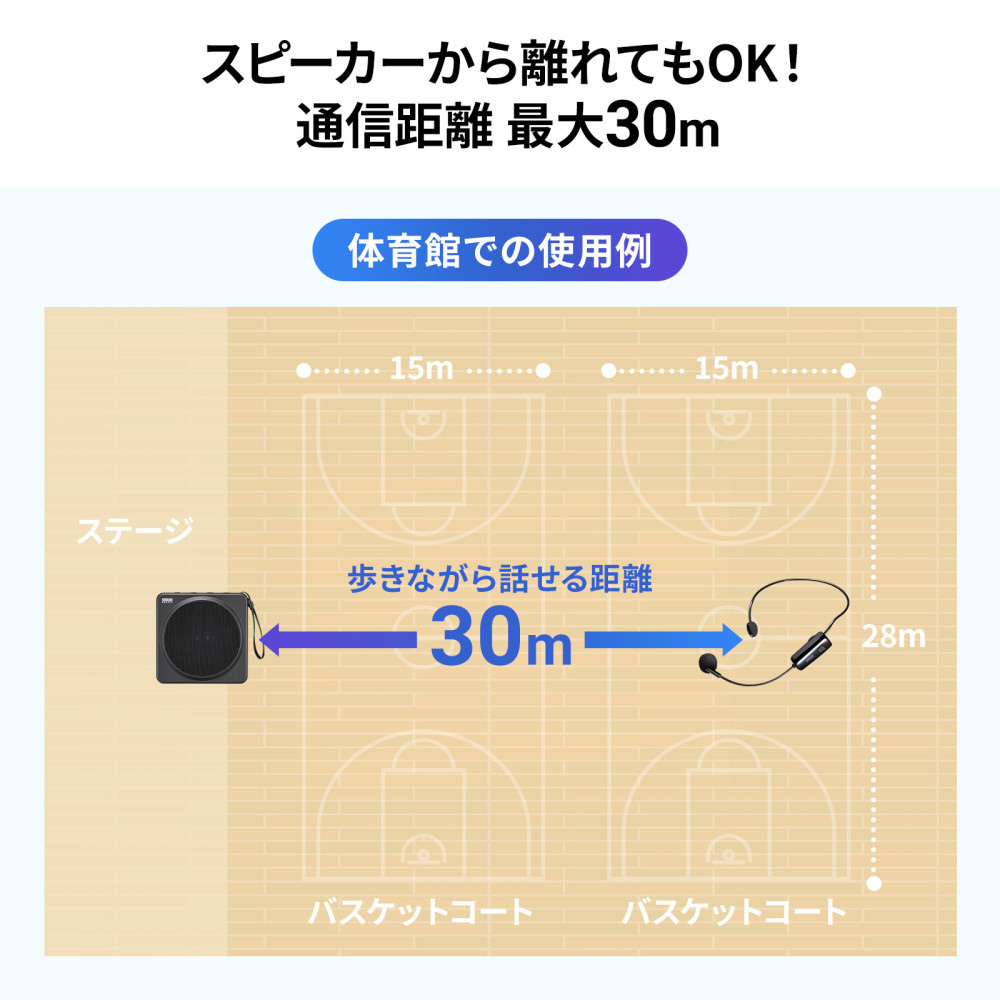 最大25Wの高出力で遠くまではっきり聞こえる。ワイヤレスヘッドマイクでスピーカーを卓上に置いたまま自由に動けるワイヤレス拡声器スピーカー。