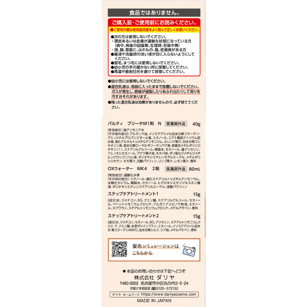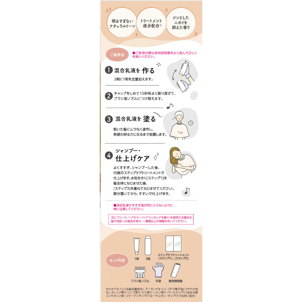 | 成分2 | 【2剤】[有効成分]:過酸化水素 [その他の成分]:エタノール、塩化ステアリルトリメチルアンモニウム、水酸化カリウム、精製水、セタノール、ヒドロキシエタンジホスホン酸液、ポリオキシエチレンステアリルエーテル、流動パラフィン |