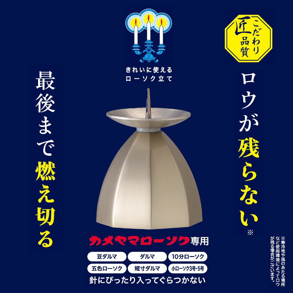 「安心して供養のひとときを過ごしてほしい」そんな長年の思いから生まれたカメヤマローソク専用のローソク立て、その名も「あんしん燭台」。幾度も試験を重ねてようやく辿りついた機能性とデザイン性を追求した匠品質のローソク立てです。