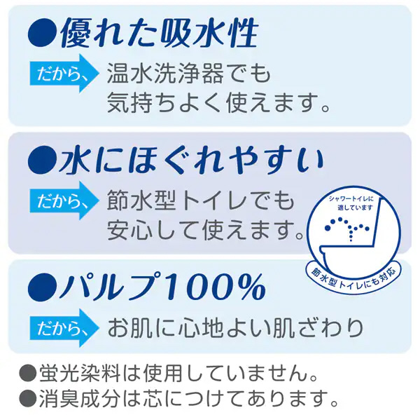 パルプ配合にこだわり、シングルはしっかりなめらか仕上げ。優れた吸水性で、温水洗浄便座でも気持ちよくご使用いただけます。「香りなし」だから、お好みの芳香剤が楽しめます。