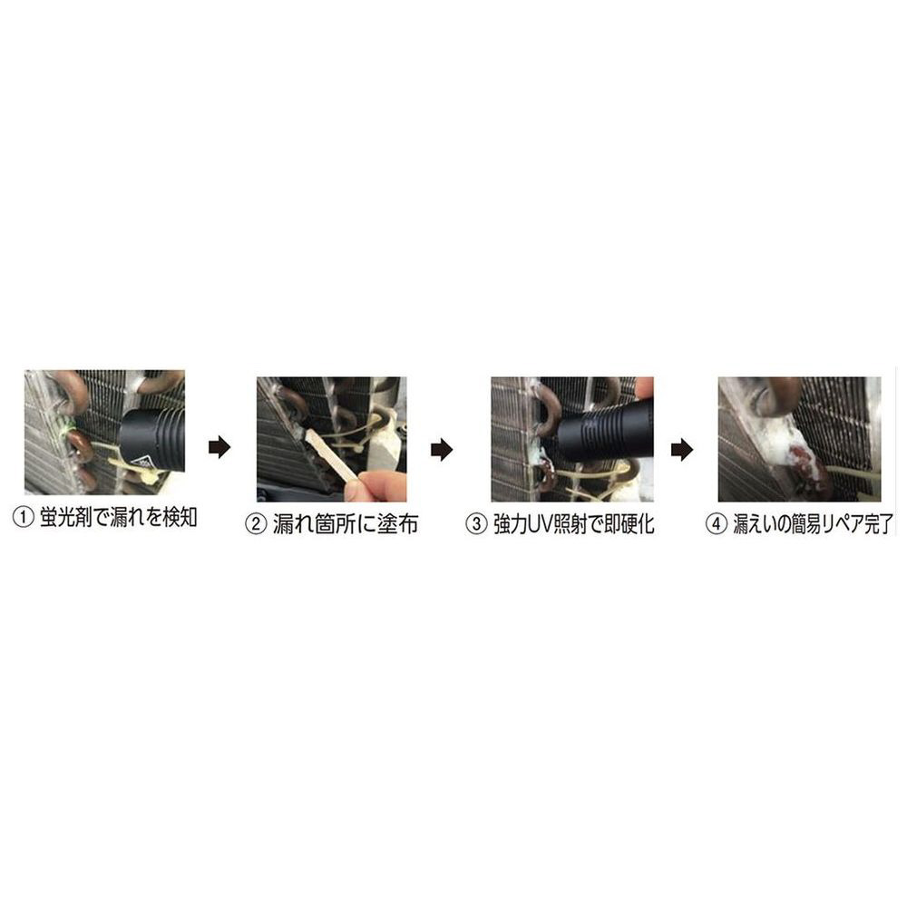 ●蛍光剤で漏れをピンポイントで検査し、そのままUV照射で簡易補修が可能!