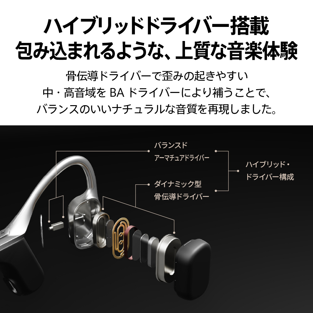 ●ダイナミック型骨伝導ドライバーとバランスドアーマチュアドライバーを組み合わせた、ハイブリッド・ドライバー構成。