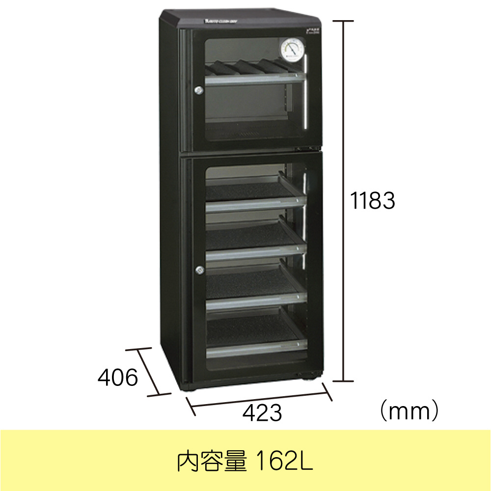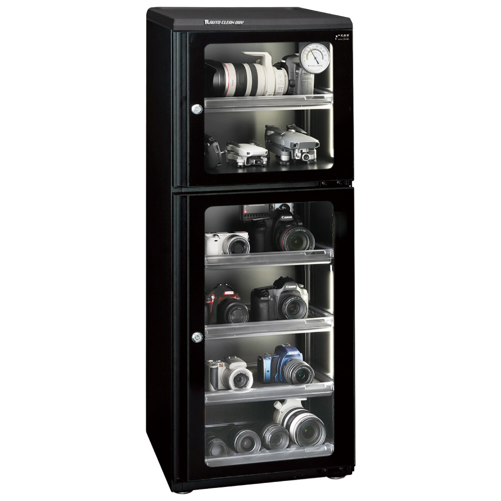 作業時に傷つきにくい樹脂製トップテーブルと充電可能な庫内コンセントを採用。レンズホルダーも付属した出し入れに便利な引出棚も採用。全面ガラスと一体取っ手のすっきりとした扉の縦型のスタンダードシリーズのブラックボディは、発売以来のベストセラーモデル。2枚扉の大容量162リッタータイプ。
