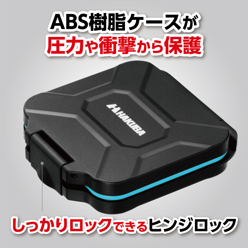 丈夫なABS樹脂ケースが外部からの圧力や衝撃からメモリーカードを保護します。ヒンジロック式でしっかりとロックできます。