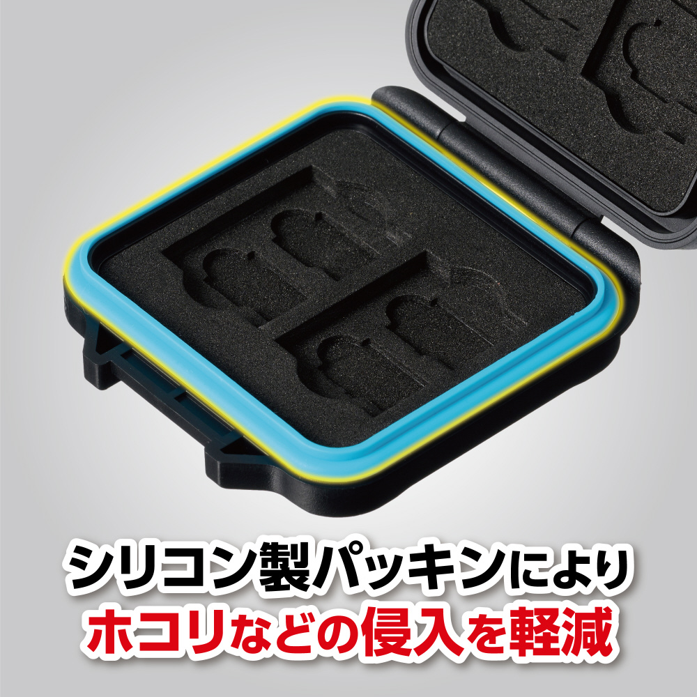 ABS 樹脂製ケースと内側のクッション材が外部からの圧力や衝撃からメモリーカードを保護します。内部のシリコン製パッキンにより外部からの埃などの侵入を軽減します。内部のシリコン製パッキンにより外部からの埃などの侵入を軽減します。