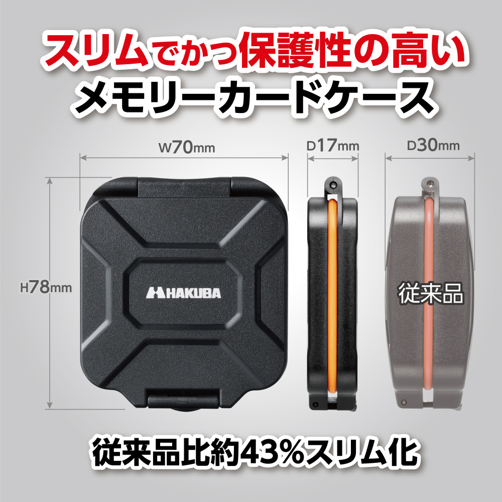 従来品比約43%スリム化した樹脂製メモリーカードケースです。厚さわずか約17mmながら丈夫なABS樹脂とクッション材で大切なメモリーカードを保護します。