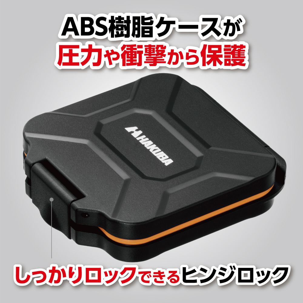 丈夫なABS樹脂ケースが外部からの圧力や衝撃からメモリーカードを保護します。ヒンジロック式でしっかりとロックできます。