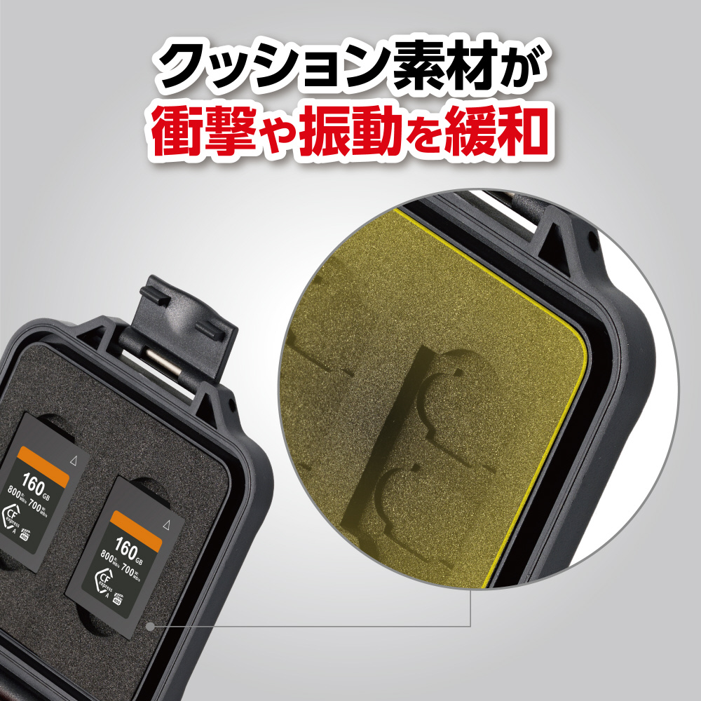 ABS 樹脂製ケースと内側のクッション材が外部からの圧力や衝撃からメモリーカードを保護します。内部のシリコン製パッキンにより外部からの埃などの侵入を軽減します。
