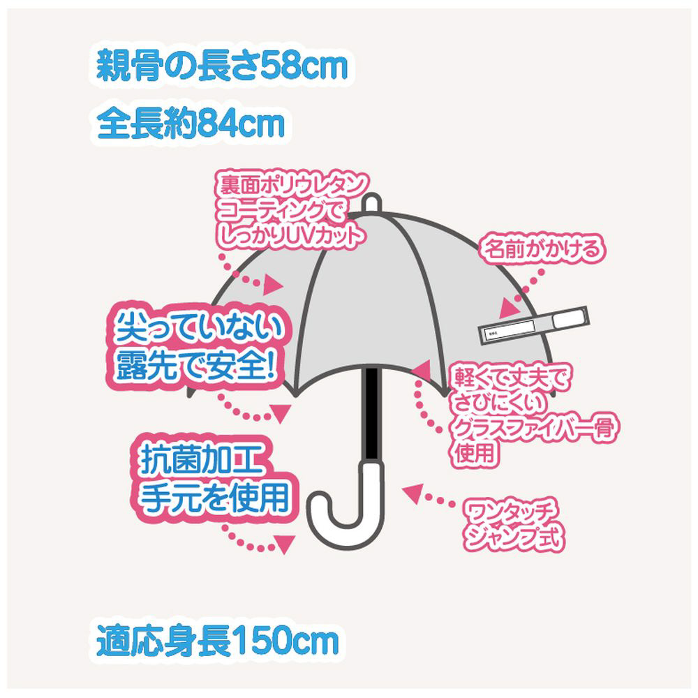 シンプルなデザインなので、通学時にも使いやすい、晴雨兼用の日傘です。T型の露先を使用しているので、先端が丸くなっており、通常尖っていたり、飛び出していて危ない露先が出ていないため安全です。手元は抗菌加工を施した手元を使用しています。