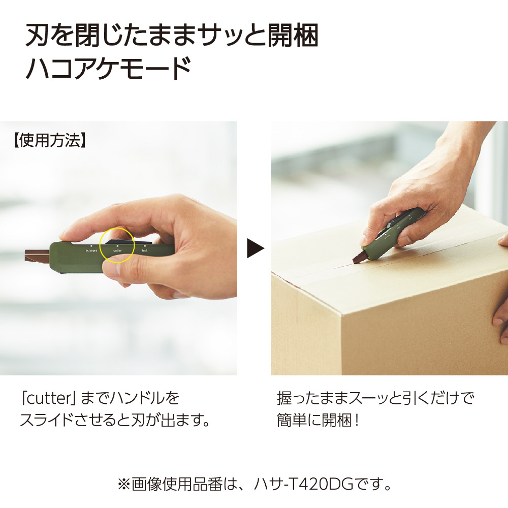 ●キャップのいらないスライド機構。ハンドルを軽く押してスライドすると、「開梱カッターモード」「ハサミモード」に片手でサッと切り替えられます。