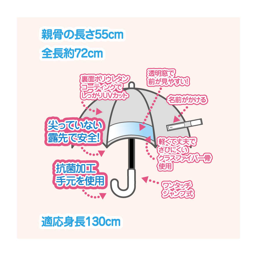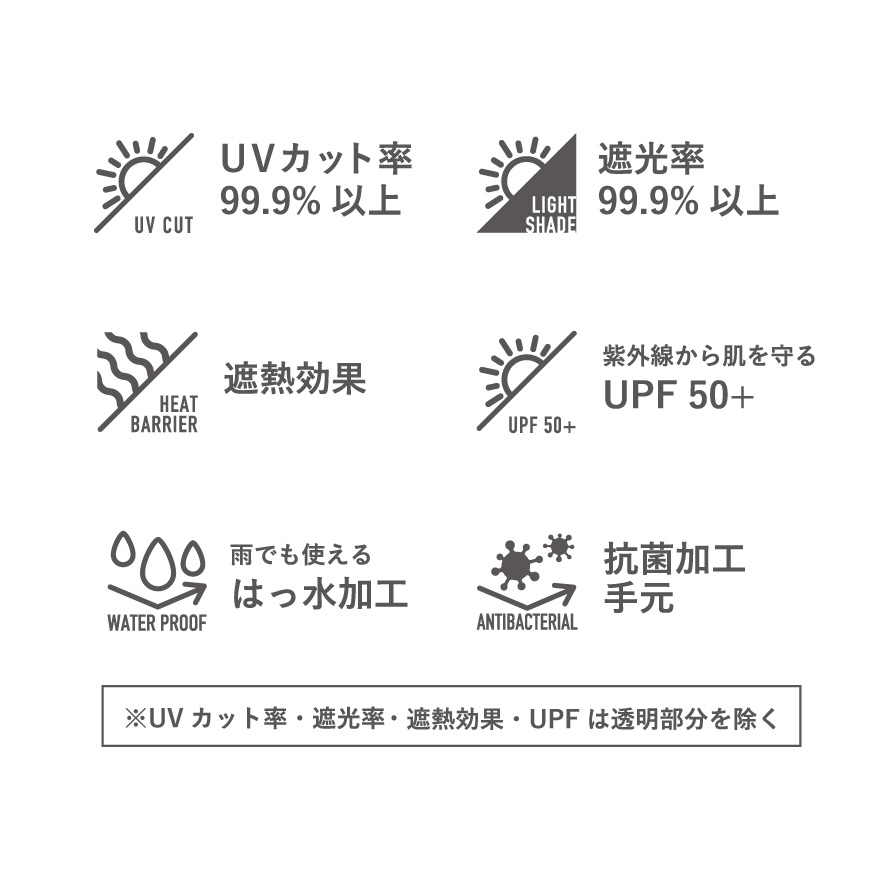 裏側コーティングがしてあるので、UVカット率&遮光率99.9%以上、遮熱効果だけでなく、はっ水機能もついているので雨の日でもお使いいただけます。T型の露先を使用しているので、先端が丸くなっており安全です。傘をさした際の正面の生地部分に、裾から12cmほどまで透明窓がついており、前が見やすくなっています。また、手元は抗菌加工を施した手元を使用しています。