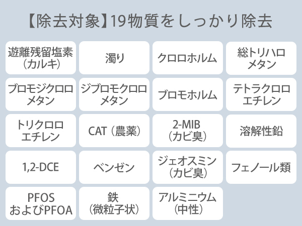 | 除去成分/総ろ過流量 | 遊離残留塩素/濁り/総トリハロメタン/クロロホルム/ブロモジクロロメタン/ジブロモクロロメタン/ブロモホルム/テトラクロロエチレン/トリクロロエチレン/1.2-DCE、CAT(農薬)/2-MIB(カビ臭)/溶解性鉛/鉄(微粒子状)/フェノール類/アルミニウム(性)/ベンゼン/ジェオスミン(カビ臭)/PFOSおよびPFOA/総ろ過流量各12000L(※) |