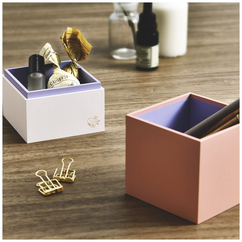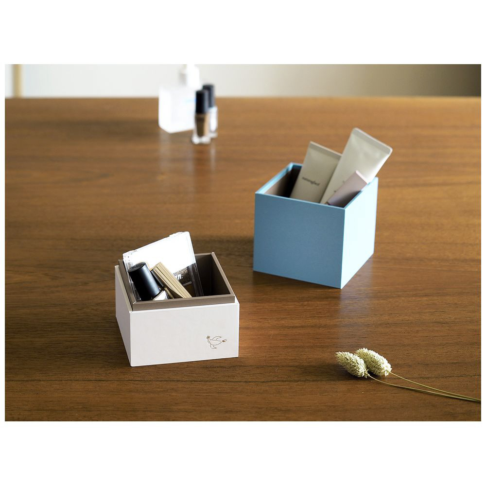 重ねて収納できる、環境に優しい紙素材の卓上小物入れです。ちょこんと置いてかわいいサイズ感。メガネやよく使うペン、ストックなどを分けて収納ができます。