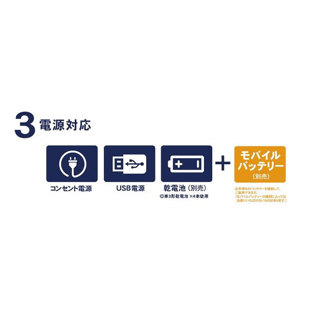 3WAY電源(コンセント、USB、乾電池・単3形4本※別売)対応。