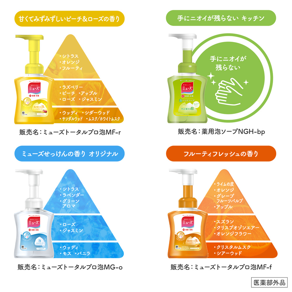 ふわふわの泡と、さわやかなフルーティーフレッシュの香りで毎日の手洗いを楽しく。