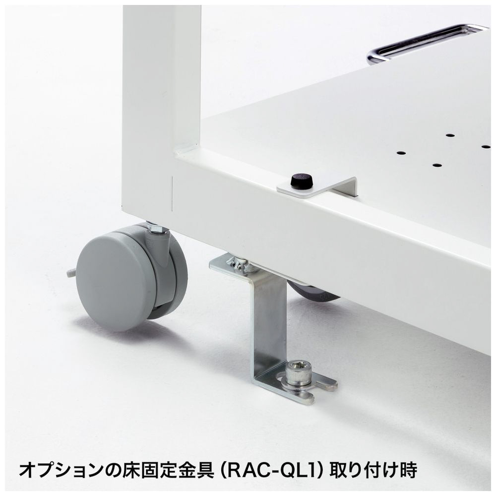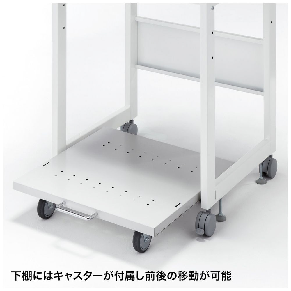 ※収納位置で固定できるストッパー付き。キャスターが付属し前後の移動が可能です。下段棚は前後のキャスター間に本体のフレームがあるため一定の位置より前には出ません。